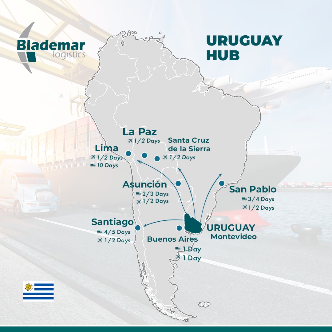 Uruguay is a prominent Logistics HUB in the region and has Free Trade Zones, which allows you to send the cargo to Uruguay → store it tax-free → and reship it to its final destination, centralizing inventory, reducing costs and lead times.